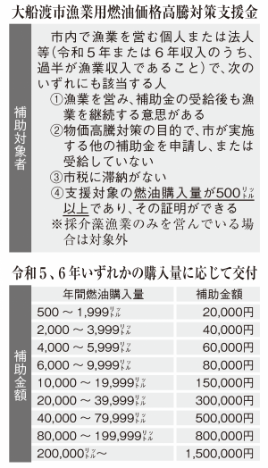 大船渡市 令和7年10月22日付 1面 漁業燃油購入費に補助 3年ぶり独自負担軽減策 実績9区分で2~150万円 大船渡市は、燃油価格高騰などで経営コストが増大している漁業者の負担軽減に向け、年間燃油購入量に応じた補助金制度を設けた。コロナ禍対策として…
