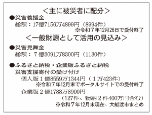 大船渡市 令和8年1月16日付 1面 義援金17億7156万円に 大規模林野火災 今後は見舞金として対応 大船渡市大規模林野火災以降、同市に寄せられた災害義援金が先月末現在で17億7156万4899円となった。同26日で受け付けを終了し、今後は…