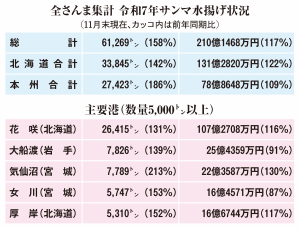 大船渡市 令和7年12月4日付 1面 大船渡 本州一の座キープ 全さんまの11月末集計 水揚げ数量7826㌧ 2位の気仙沼と僅差 全国さんま棒受網漁業協同組合(全さんま)は、令和6年・7年の対比サンマ水揚げ状況を発表した。11月30日現在、大船渡市魚市場に水揚げされた…