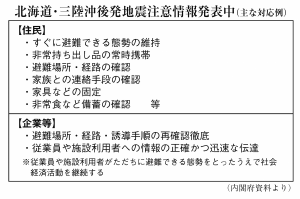 その他 令和8年4月22日付 1面 後発地震注意情報を発表中 気仙3市町などで27日まで 内閣府と気象庁 特別な備えや再確認を 20日夕に発生した三陸沖地震を受け、内閣府と気象庁は同日夜、気仙3市町を含む太平洋沿岸など7道県の182市町村に「北海道・三陸沖後発地震注…