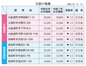 広域 令和8年3月18日付 7面 気仙両市 6年連続の下落 全用途の平均価格と変動率 令和8年の公示地価発表 人口減や建築費の高騰で 土地取引価格の指標となる令和8年の公示地価が17日、発表された。宅地、商業地などを合わせた全用途の平均価格と変動率は、大船渡市が3万470…