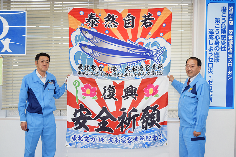 大船渡営業所は震災発生直後から、甚大な被害を受けた被災地の復旧活動と業務機能の正常化に尽力。非常時にもかかわらず、これまで通り無事故で業務を全うしたことが評価され、東北電力の平成25年度お客さま本部長(副社長)表彰を受賞した。