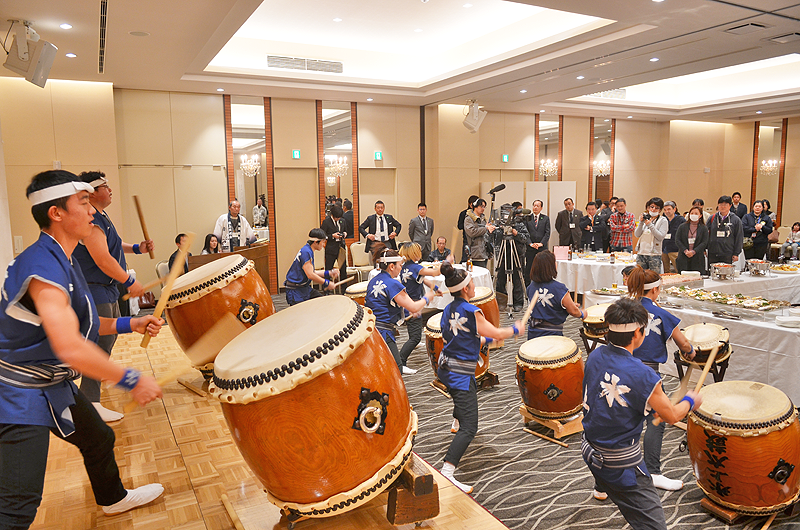 乾杯後、ステージ披露のトップを飾ったのは氷上共鳴会による氷上太鼓。「うごく七夕」のまつりばやしも響かせ、陸前高田らしさを呼び込んだ。