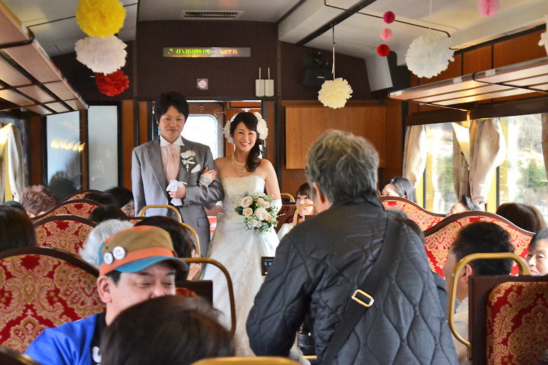 この日は、新郎新婦の入場シーンも車内で収録。新郎新婦役は、結婚生活2年目で赤崎町在住の古内清満さん(28)と妻・有希さん(32)。りりしいスーツ姿の清満さんと美しいウエディングドレス姿の有希さんが登場すると、座席に座っていたギャラリーが拍手で迎え、本当の結婚式のように祝福の笑顔を向けた。