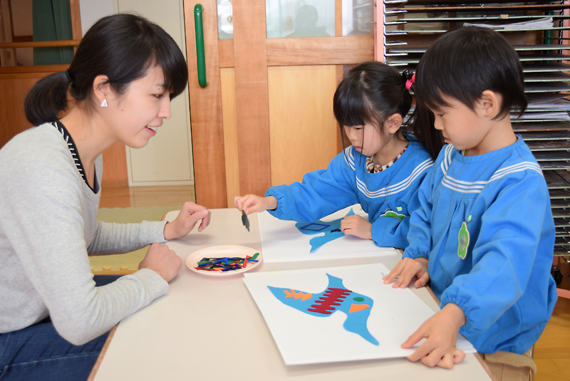 24日は、同大学関係者8人が大船渡保育園と放課後児童クラブ「うみねこキッズ」を訪問した。このうち大船渡保育園では、年長児33人がワークショップに参加。カモメを連想させる形に切り取られた布の上に、色も大きさも多種多様なフェルトを置いていった。
