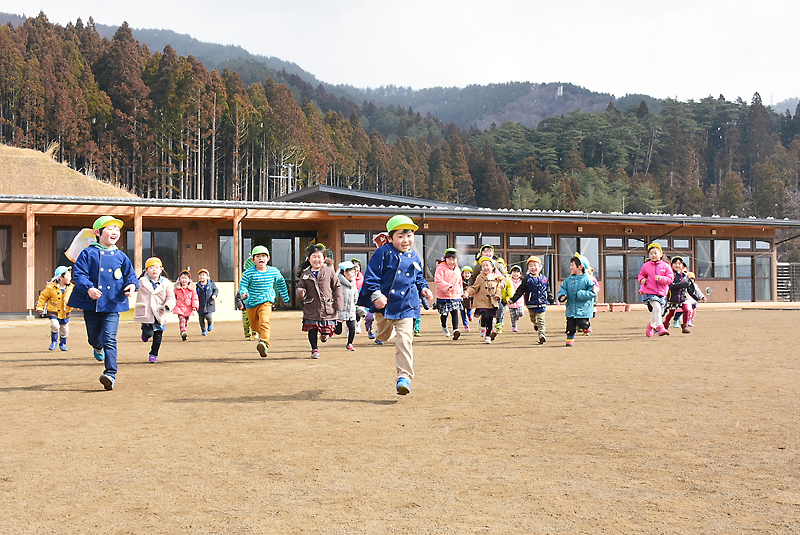 大船渡市三陸町の越喜来湾を一望する海抜53㍍の高台に、越喜来小学校と一体的に整備された越喜来こども園。昨年11月に供用開始して以来、園児の元気な声が響いている。「あの日」があって生まれた新しい風景の中で、無邪気にはしゃぐ子どもたちの姿は、復興の途上にある地域へ明るい光を差す。