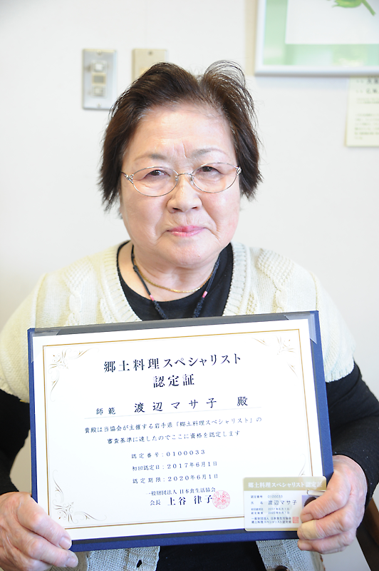 大船渡市立根町の渡辺マサ子さん(73)が、一般財団法人・日本食生活協会(東京都上谷律子会長)によって岩手の郷土料理スペシャリスト(師範)に認定された。今回、県内で認定されたのは渡辺さんを含め3人で、認定期間は3年間。渡辺さんは認定を励みに、気仙の食文化継承へ気持ちを新たにしている。