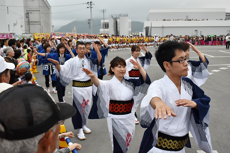 開催式などをはさみ、午後6時からは市内外の22団体、約1100人が参加して道中踊りをスタート。浴衣やはっぴ姿の踊り手たちが「気仙甚句囃子」「おおふなと椿音頭」に合わせて笑顔で踊り、まつりは最高潮を迎えた。