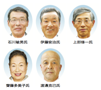 ▽上部修一氏(うわべ・しゅういち)=平成17年から29年までの12年間にわたり、竹駒地区コミュニティ推進協議会長を務め、26~29年まで陸前高田市コミュニティ推進協議会連合会副会長を務めるなど、多年にわたり地方自治と市勢発展に貢献した。