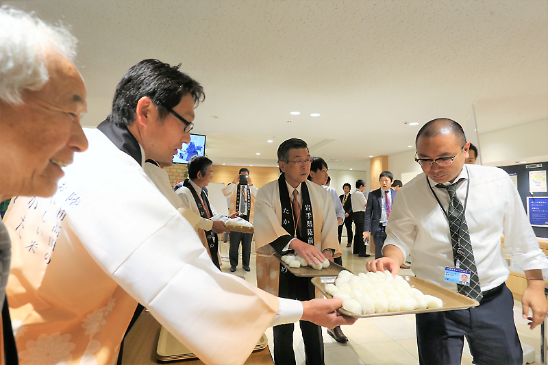 東京では今回、日本屈指の総合商社・伊藤忠商事㈱と、同社グループ企業である伊藤忠食糧㈱ほか、JT本社などを訪問。このうち伊藤忠商事では、参加者8人と市農林課「たかたのゆめ」係の職員2人がPR用のはっぴを着用し、昼時に社員食堂の前で一口サイズのたかたのゆめおにぎりを配布した。