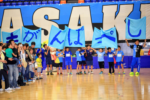 地元の子どもたちが手作りフラッグを掲げて選手を出迎え