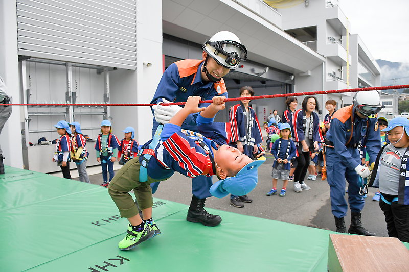 このうち、救助体験では水平に張られた長さ9㍍のロープをつたって渡り、中には救助隊員顔負けの素早さで渡りきる園児も。煙が充満した部屋に入り、火災時の避難のあり方を確認する「煙体験」では、消防士から「火事の時は煙を吸い込まないよう頭を下げて、口に手を当てて避難して」と指導を受けた。