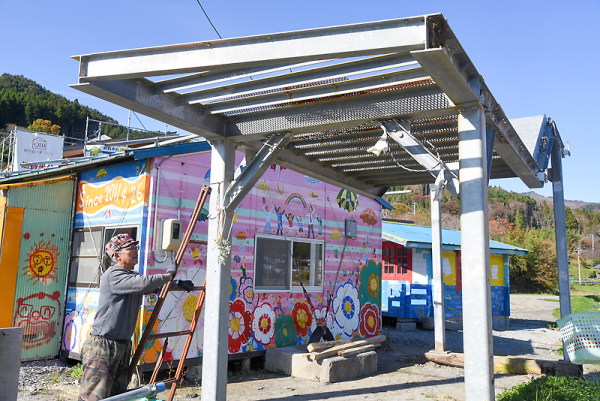 東日本大震災津波で発生した廃材で大船渡市三陸町越喜来の被災跡地に建てられ、地元住民やボランティアの集いの場となっていた大津波資料館「潮目」は、同跡地へのイチゴ農場整備が本格化するのに伴い、17日までに解体された。同資料館に置かれていた旧越喜来小学校の非常階段などの〝震災遺構〟は、同資料館を建設した片山和一良さん(67)=越喜来=が所有する近くの私有地に移された。移設先には大船渡町にあった理容室の仮設店舗など複数の施設が移築されており、片山さんは、この場所が人々の交流し合う新たな〝潮目〟となることを願っている。