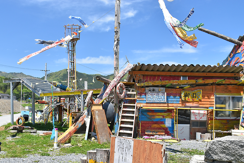 流れの違う海流同士がぶつかり、多くの魚が集まる潮目のように、人と人とが交わり合う場となってほしい──。そんな思いが込められた資料館「潮目」は、震災翌年の平成24年7月、被災跡地である旧越喜来小跡地向かいに開館。子どもたちの隠れ家ともなるよう、資材はすべて廃材を使った。