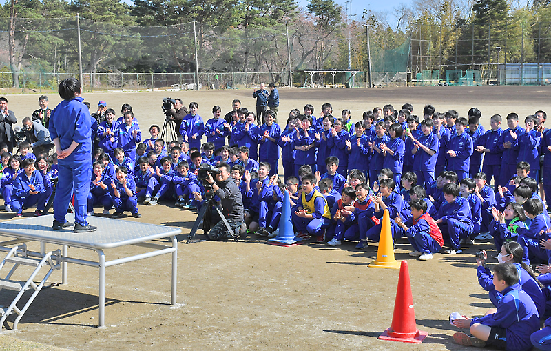 菅野陽菜子生徒会長(3年)は「校庭が復活し、とてもうれしい。きょうはみんなで元気な姿を発信する有意義な日としましょう」とあいさつ。熊谷校長は「感謝の気持ちを忘れず、この校庭を使いながら陸前高田市に活気を与えていって」と呼びかけた。