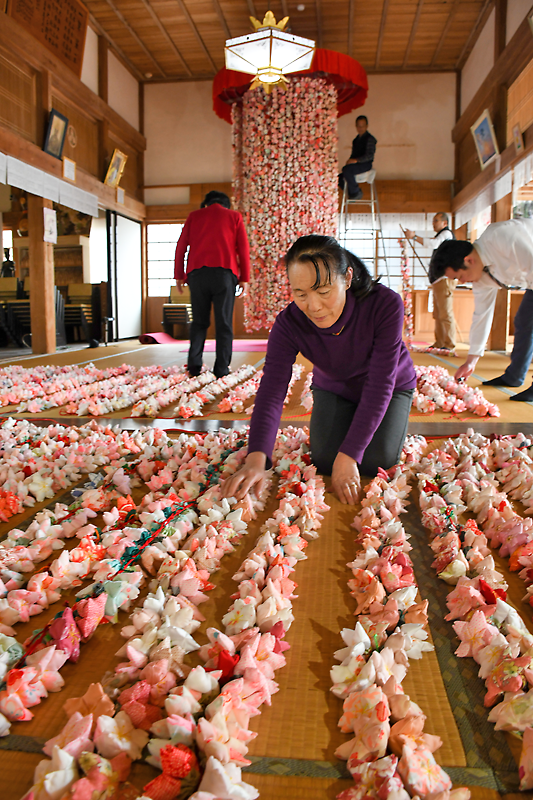 ねがい桜は、50〜100個ごとに赤いひもでくくり付けている。本堂の一角にまとめてつるし、高さ3・7㍍、直径2・1㍍の大きなつるし雛を完成させた。