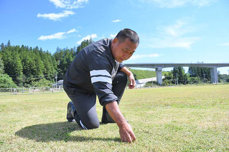 国内初のサッカーのナショナルトレーニングセンター「Jヴィレッジ」(福島県)の芝生化を手がけ、「芝の神様」と称される京都府京都市の松本栄一さん(63)は、整備当初から芝生の育成、管理に携わっている。芝生を植え替える時期に合わせ、現在も年に2~3回、無償でグラウンドを訪ねており、9月下旬にも冬用芝生の種まき作業に汗を流した。