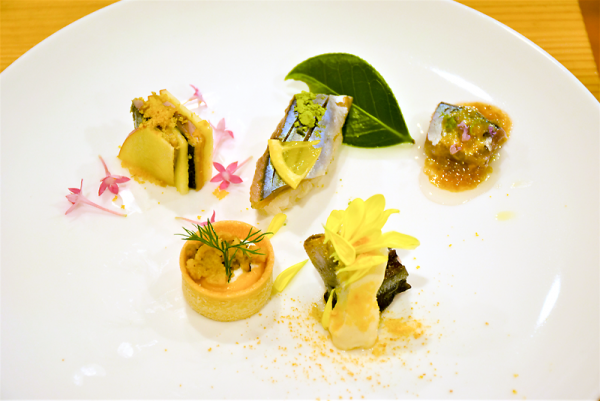 前菜は、田嶋シェフが2品、小野シェフが3品を調理。このうち、サンマ料理は4品で、田嶋シェフはにぎりずしやクリーミーな西京みそを添えたあぶりに、小野シェフは薫製、カルパッチョにアレンジした。