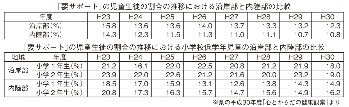 沿岸部の「要サポート」児童・生徒の割合は、発災後の23年度が15・8%。24、25年度は13・6%と下降傾向にはあるものの、年度によってまた上昇するなど「一進一退」の状況が続く。
