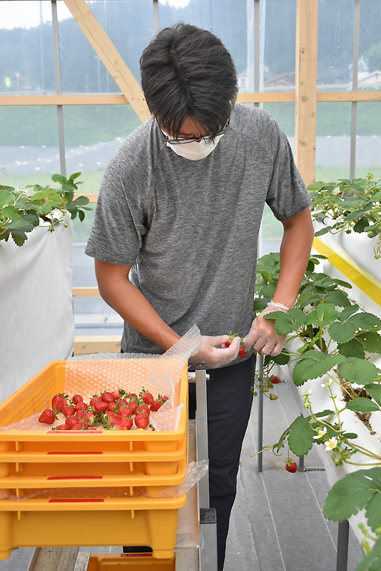 太田代表取締役(43)は、県農業研究センターの研究員として平成26年に大船渡市に移住し、陸前高田市米崎町の園芸研究施設でイチゴの周年栽培を研究。夏は冷涼で冬は暖かいという県沿岸部の気候を生かし、冬から春にかけてが旬のイチゴを通年にわたって収穫する技術開発に成功すると、30年に就農、昨年2月に同社を立ち上げた。