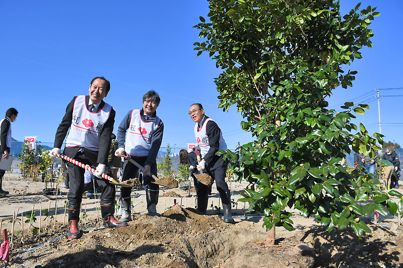 畑の中央に植えたシンボルツリーは、樹齢約30年、高さ約3・5㍍のヤブツバキ。代表者らが根元に土をかぶせ、健やかな成長を願った。