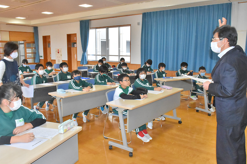 大船渡市立大船渡小学校(三浦和人校長、児童139人)の4年生30人は津波を想定し、自身が取るべき避難行動をまとめる独自の「私の津波ブック」作りに取り組んでいる。18日は東日本大震災当時、同校の校長だった柏崎正明市教育委員(68)=猪川町=の講話を受け、発災時の状況や避難の教訓を学び、自分で命を守る意識や、震災を語り伝える意義を学んだ。