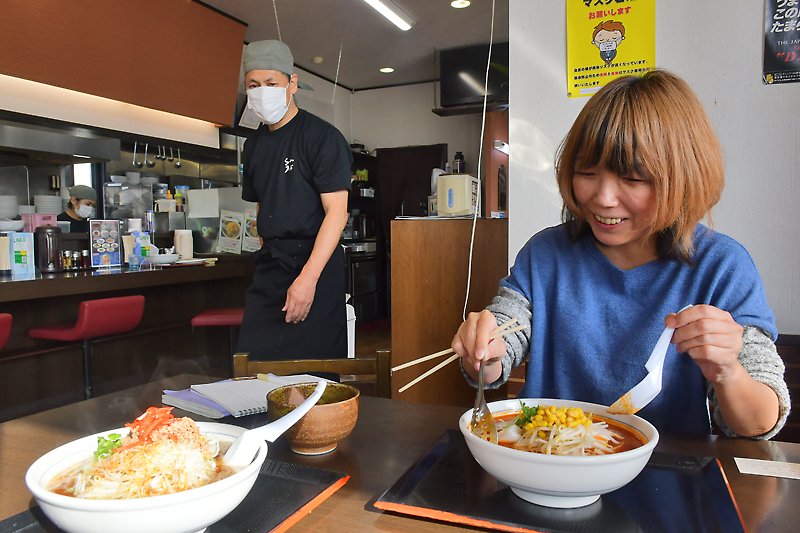このうち、最終日の19日には、大船渡市赤崎町のらーめんランド大船渡店を訪れ、経営する㈲ナカジマの中嶋隆一代表取締役らが対応。同店は店舗を構えて4カ月後に東日本大震災で被災しており、営業再開までの経緯などを明かした。