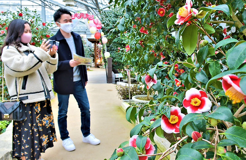 大船渡市の早春を代表する催し「三陸・大船渡第24回つばきまつり」は6日、末崎町の世界の椿館・碁石で開幕した。新型コロナウイルス感染防止策のため、初日の開催式は見送られたが、気仙3市町などから続々と地域住民が来場。多くのツバキが見ごろを迎えており、来訪者は個性や美しさをじっくりと楽しんでいた。まつりは、3月21日(日)まで開かれる。