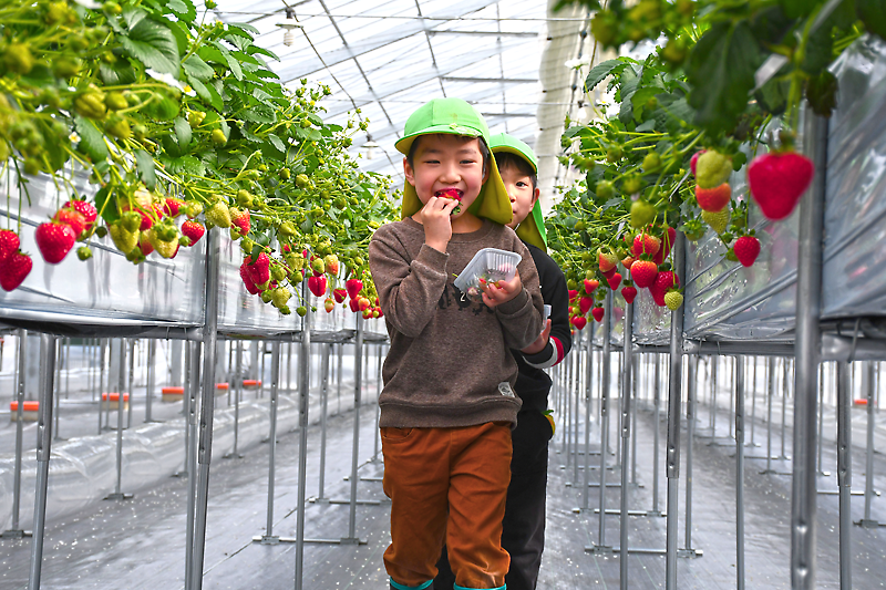 同園年長の菅野麗ちゃん(6)は「イチゴがいっぱいあって、びっくりした。甘くておいしい」と喜び、同校1年の村上朔哉君(7)は「次はお父さん、お母さんたちと一緒に食べに来たい」と笑顔をみせた。