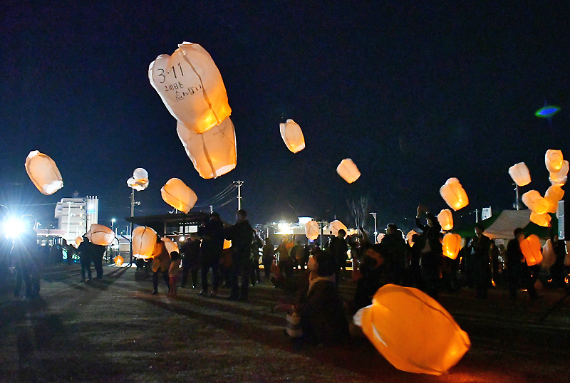 打ち上げは、震災犠牲者に鎮魂の祈りをささげる「3・11キャッセンキャンドルナイト2021」の一環で実施。スカイランタン実行委員会(新沼崇久実行委員長)が主催し、大船渡商工会議所青年部や大船渡青年会議所、盛青年商工会、本増寺、㈱キャッセン大船渡が共催した。