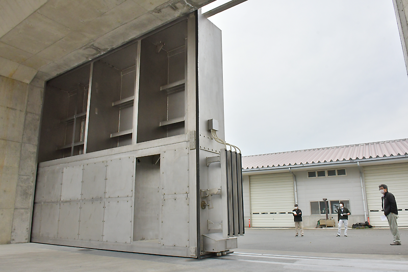 その後、4分をかけて高さ4・7㍍、幅9㍍の門扉がゆっくりと閉鎖。挟み込み防止装置も付いており、人や車両が近づくといったん停止する機能も確認した。