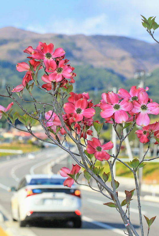 ちょうど「母の日」のころに開花を迎えるハナミズキの街路樹は、同市の「ハナミズキのみちの会」(淺沼ミキ子代表)などが植えたもの。高田町の国道45号が通る高田松原の海沿いから、山側の「北幹線」までを結ぶ約2㌔の道沿いに、濃い桃色と白の花木が交互に立ち、五月晴れの下で誇らしげに咲いている。