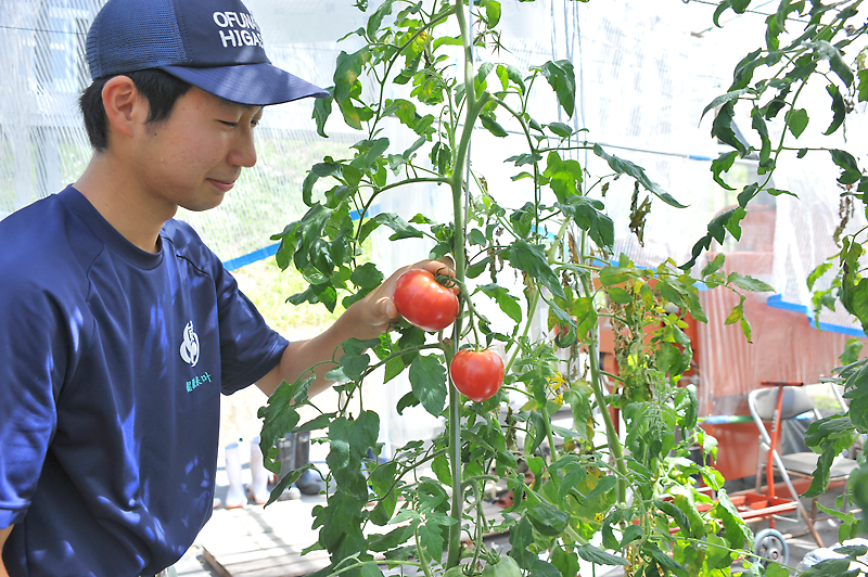 県立大船渡東高校(鈴木博校長)の農芸科学科は、立根町の萱中いこい農場で生食用大玉トマトの生産に力を入れて取り組んでいる。本年度は例年の管理方法に工夫を施し、高糖度トマトの生産に成功。今後の目標は安定生産と収量増加で、同学科の生徒たちが「おいしいトマトを届けたい」と日々の管理に熱を注ぐ。