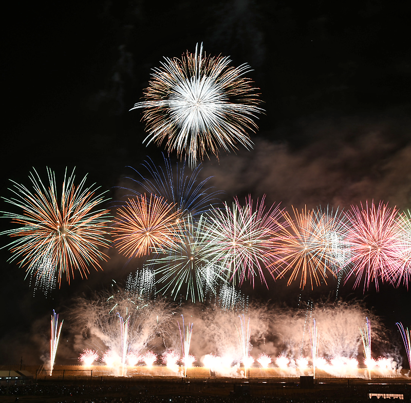 新型コロナウイルス禍の中での開催となり、実行委は感染症対策を徹底。人との距離を保って鑑賞できるよう有料席は野球場やサッカー場、多目的広場内に指定して設け、車に乗ったまま眺められるドライブイン席も用意した。