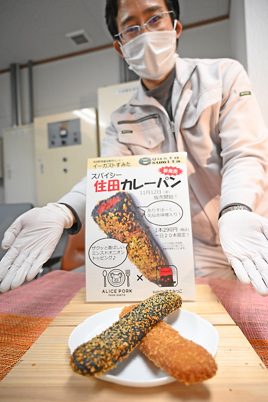 住田町観光協会(佐々木慶逸会長)と㈲ありす畜産(水野雄幸代表取締役)は、同社の豚肉を使用した「スパイシー住田カレーパン」を共同開発した。12日(金)から、世田米で同社が運営する町特産品販売センター「イーガストすみた」での販売開始を予定しており、関係者は商品を通じた住田産食材の魅力発信、フードツーリズム推進に意欲を見せている。