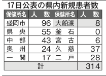 県などは17日、大船渡市8人を含む314人から新型コロナウイルスが検出され、患者2人が死亡したと発表した。同市のうち4人は、これまでに大船渡保健所管内で発生したクラスター(感染者集団)に関連。県内の累計患者は1万5000人を超え、依然として県内各地で感染が広がっている。