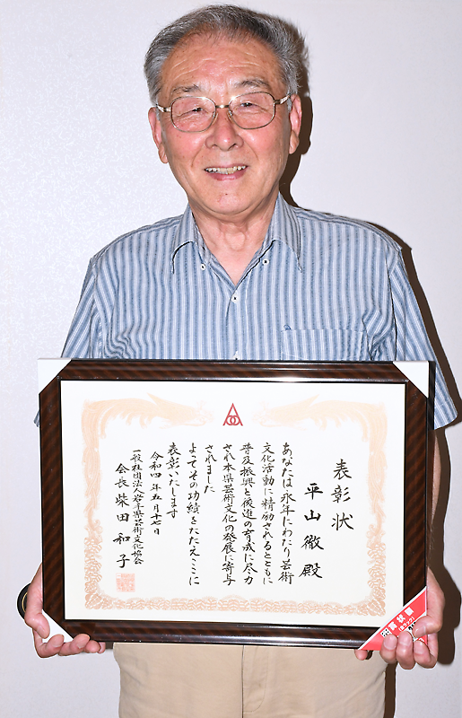 大船渡市郷土芸能協会長の平山徹さん(77)=大船渡町=は本年度の県芸術文化協会(柴田和子会長)の功労者表彰を受けた。長く市郷土芸能協会の役員を務めているほか、地元の赤澤鎧剣舞と曲禄を伝承する「赤澤芸能保存会」の会長として、郷土芸能の保存継承活動に尽力してきた功績がたたえられた。平山さんは「芸道を後世につないでいきたい」と地元の大船渡北小学校などで子どもたちの指導を通じ、後継者育成に力を入れる。 (八重畑龍一)