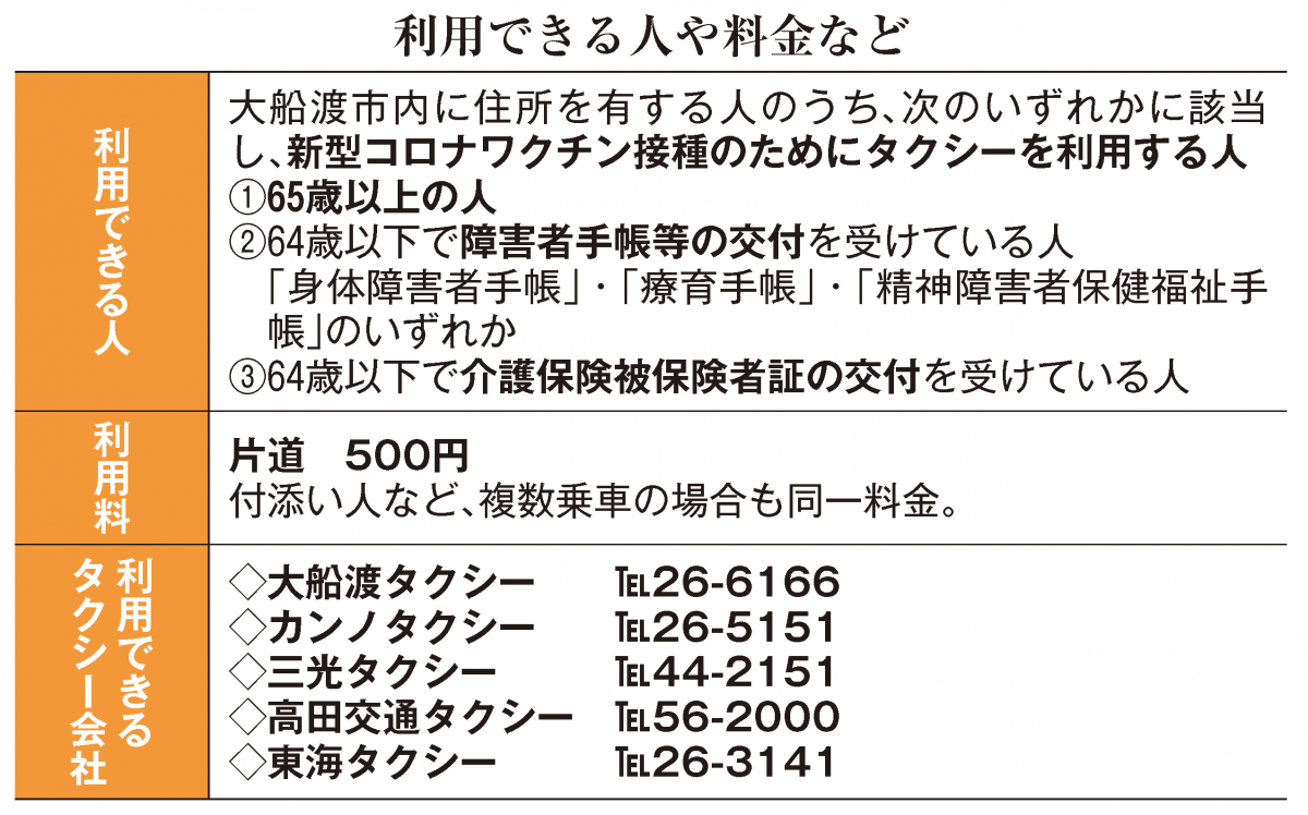 昨年度、高齢者や障害者をはじめ移動困難者の接種機会確保を図るとともに、新型ウイルスの影響で利用が減少するタクシー事業者の支援にもつなげようと事業化。県の新型ウイルスワクチン接種市町村輸送機能強化事業費補助金を活用した。