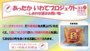 住田町の㈲ありす畜産(水野雄幸代表取締役)の商品「すみたどん」が25日(木)から、赤い羽根共同募金への寄付付き商品として販売される。県共同募金会と同町共同募金委員会による「あったかいわてプロジェクト~しあわせ運ぶお買い物~」の一環として実施。同社が運営する世田米の特産品販売センター「イーガストすみた」で取り扱い、商品価格410円(税込み)のうち10円が募金となる。(清水辰彦)