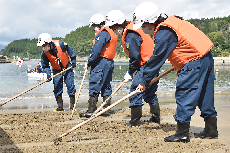 活動では、署員らが熊手やレーキを使って浜辺の砂を掘り起こしたり、岩場の隙間を確認するなど、骨のようなものがないか目を光らせた。ボートも使って海中も捜した。