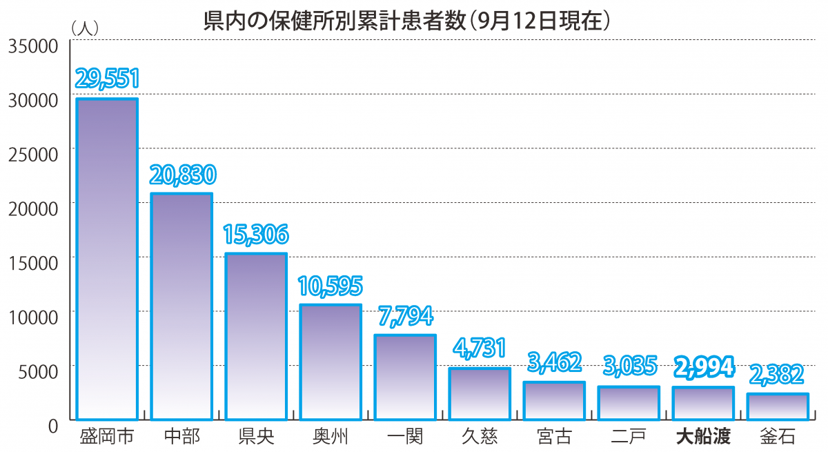 大船渡は2994人と、釜石に次いで少ない。この半数余りとなる1507人は、先月公表された患者だった。大船渡の市町別内訳は、大船渡市1803人、陸前高田市853人、住田町192人、保健所管内146人。