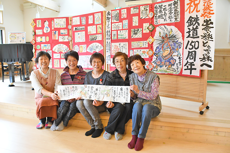 高橋さんは今回の教室に合わせ、自身が指導するサークルなどがJR新花巻駅に展示した鉄道開業150周年記念の絵手紙約80点を持参。住民に見てもらおうと、朝日の当たる家で18日(火)まで展示している。