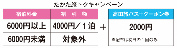 一方、地域クーポン券は宿泊代金の金額を問わず、宿泊客に一律2000円分を配る。連泊の場合も配布は1回限りで、チェックイン時に配る。宿泊客に交付している市観光物産協会(木村昌之会長)の観光周遊パスポート「高田旅パス」事業と連動させ、クーポン券は旅パスの加盟店舗・施設で使える。