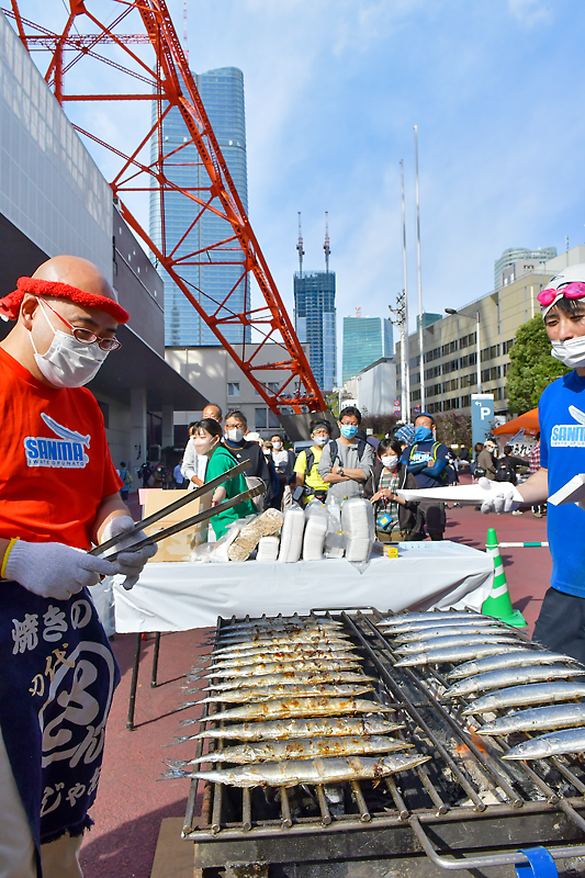 東京タワー正面口付近では、令和元年までのさんままつりに携わってきた、市職員らによる経験豊富な「サンマレンジャー」らが準備に追われた。協賛した鎌田水産㈱の協力を受け、2日前に大船渡港に水揚げされたサンマを確保。例年に比べてやや小ぶりだが、脂乗りはよく、香ばしさにあふれた。