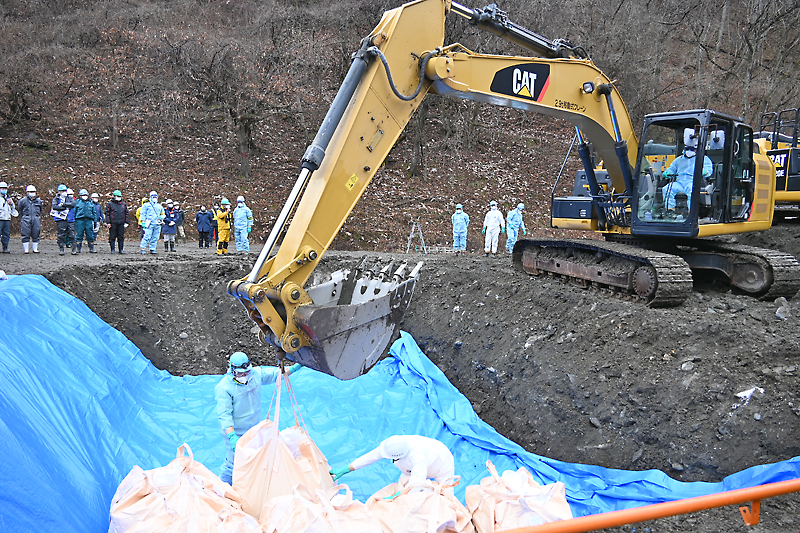 埋却作業では、重機で埋却溝(深さ2㍍、下幅6㍍、上幅8㍍、奥行き7㍍)を掘削。その上にブルーシートを敷き、重機で消毒用の消石灰、処分家禽の代わりに土を詰めた大型のバッグを投入。さらにシートをかぶせ、消毒と埋め戻しを実践した。