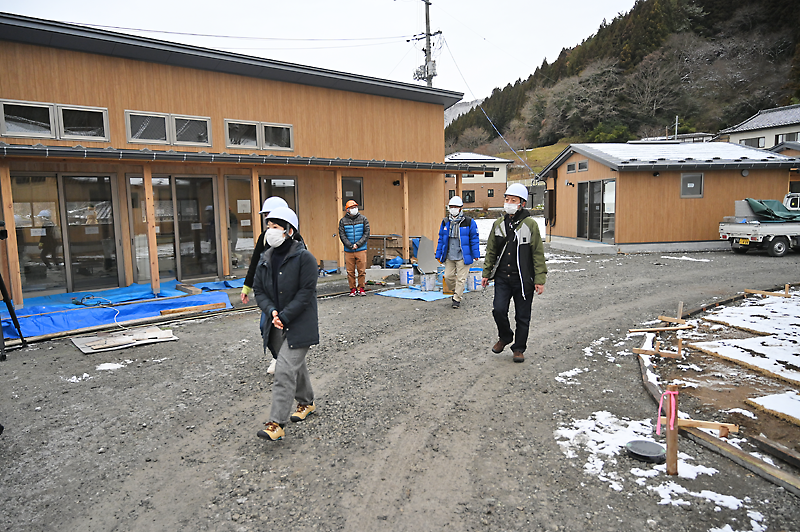 滞在体験棟は、住田を知ってもらうための〝お試し滞在〟に向けて整備。展示棟は、木造の住田型仮設住宅を再現し、内部に震災時の後方支援などといった記録を展示し、後世に伝えていく。完成は来年1月中旬、供用開始は同2月を見込む。