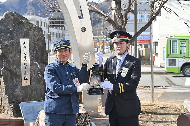 採火式では、トーチに移した「ものづくりの灯」を、JR釜石駅の髙橋恒平駅長(43)がランタンにともし、盛岡車両センターの本倉幹弘所長(49)に手渡した。この火は21日、盛岡市にある検収庫におけるSL銀河への火入れ式で種火として使用される。
