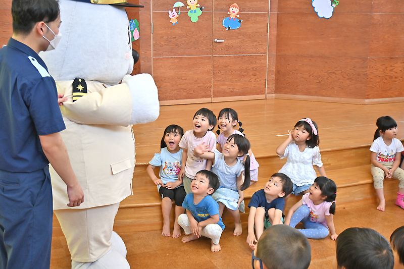 教室では、海上保安官の仕事や取り組みが紹介され、「海での火事や事故にも対応し、海の警察と消防両方の役割を担っている」「海をきれいに使ってもらうための呼びかけもしている」といった説明を園児らがうなずきながら聞いた。