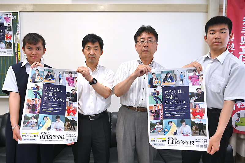 ポスターはA2判で200枚を作成。気仙や釜石市、遠野市の中学校、気仙2市1町の商業施設などに配布する。同校では本年度、都道府県の枠を超えて地域の学校で学ぶことのできる「地域みらい留学」を募集することとしており、ポスターを通じて県外にも広く魅力をPRする。(清水辰彦)