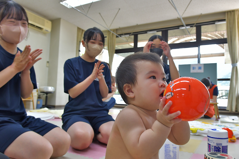 高校生が乳児との触れ合いを体験することで育児の関心や母性・父性の養成を図り、将来の妊娠・出産に向けて高校生自身の健康維持・増進の意識を高めてもらおうと実施。今回は同校2年の今野陽菜さん、1年の須貝にこさんと小西真央さんが参加した。